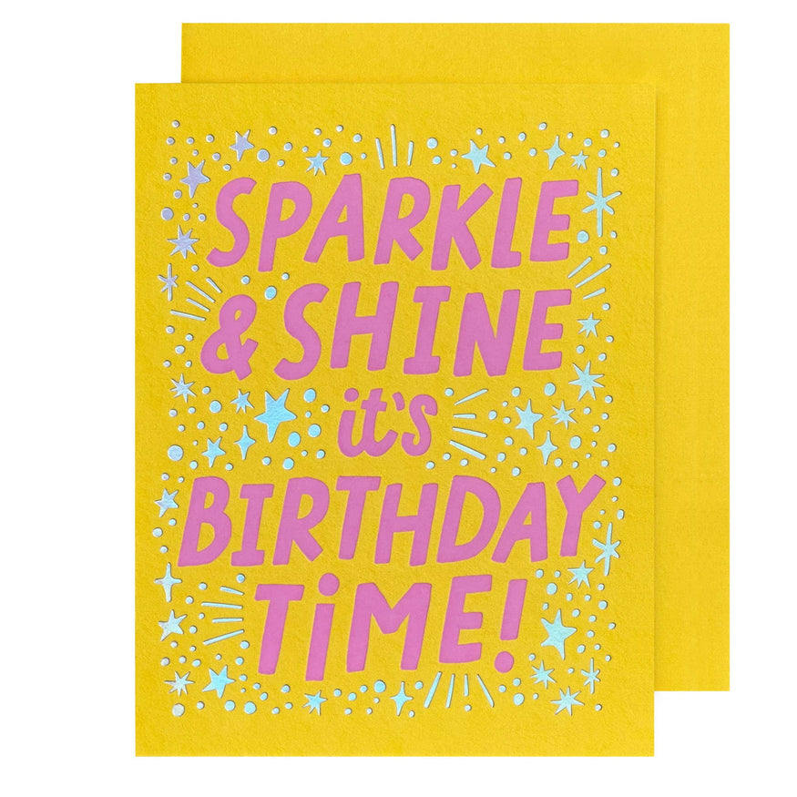Greeting: "Sparkle & Shine It's Birthday Time!" (Blank Inside) Printing: Silver Hologram Foil Card size: 5.5" x 4.25", Folded Paper: thick colored stock with coordinating A2 envelope